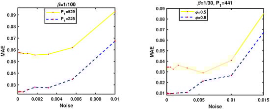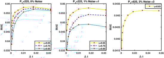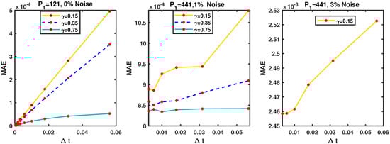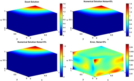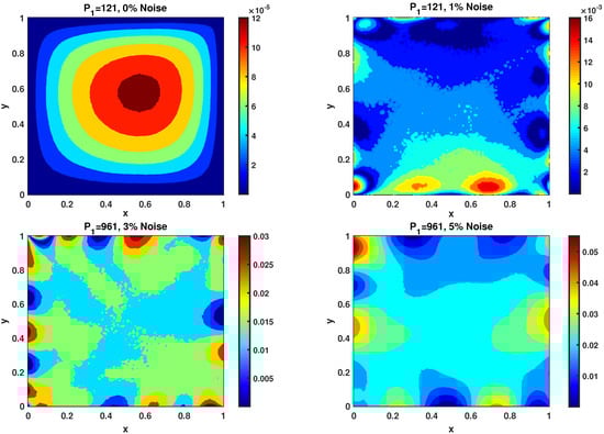 Results of the simulation are tested extensively with the ISBM [] scheme and the SAM on various and without added noise in Table 2. Next, mesh error results for the parameters , , when using the ISBM and the SAM are presented in Figure 7 and Figure 8. Compared to the problem with noise, the range of accuracy increases to , corresponding to , where the number of collocation point selection strategy works as intended. The total number of collocation points changes when a high level of noise is added to the boundary date to keep the accuracy.