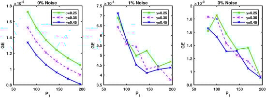 Additionally, in Figure 9 we present the associated stability curves and the influence of the fractional order of derivative on the behavior of second-grade fluids and on the number of collocation points which is necessary for convergence of the scheme considering the parameters , , . Figure 10 shows the convergence simulations for various and ; here, one can see the convergence curves are slightly more affected by compared to the simulations for . Another effect of the level of added noise is that restrictions on the shape parameter, and the number of collocation points are necessary to ensure the convergence of the scheme. Although we have decreased the level of added noise to in Figure 11, the results are influenced more by the than in the previous simulations for .