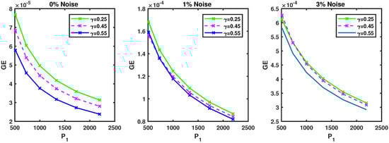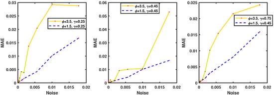 Here, we restrict our simulation results to one set of parameters, , , where the TM [] scheme and the SAM on various γ with added noise are tested in Table 3. In the higher level of additive noise, failures of the SAM may also cause reduced accuracy, especially for small step sizes. In such a case we increase the total number of collocation points for a high level of noise added to the boundary date to keep the accuracy. We repeat the scheme on the star-shape and square-shape domains with a different additive noise. Figure 12 and Figure 13 compare the behavior of the scheme on the domains. Additionally, for each of these graphs, we provide the error mesh in 3D. Further, in Figure 14 we present the associated stability curves and the influence of the fractional order of derivative γ, with the color of noise defined by the value of the slope of the power spectrum density (PSD) of the linear regression on the log-log scale. The PSD of a noise scales as a power law of the frequency f, that is, , then the noise is white if and pink for [].