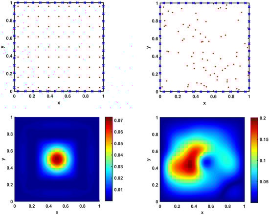 We implemented the meshless strategy proposed in Section 2 for the inverse problem in Equation (1). We tested the resulting scheme extensively for , and the noisy data are generated using the following formula