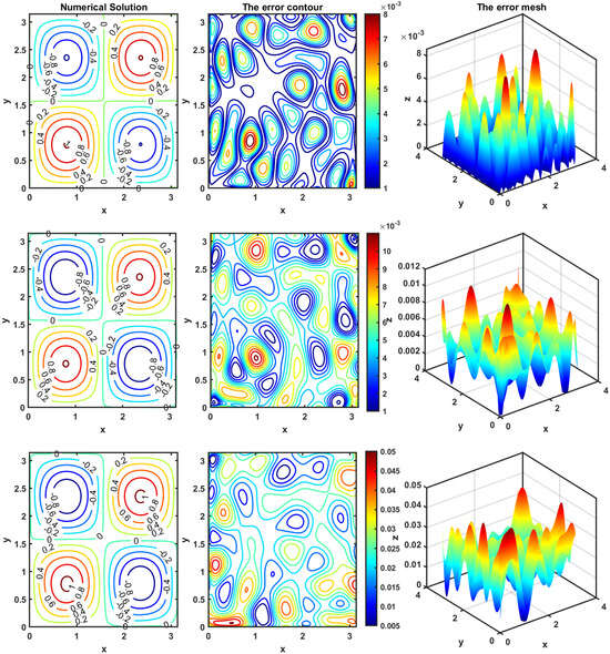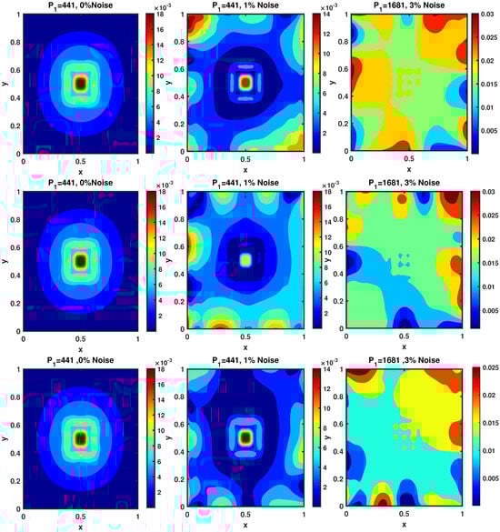 The error contour of Example 3 at : (top to down) , and Noise, , , , .