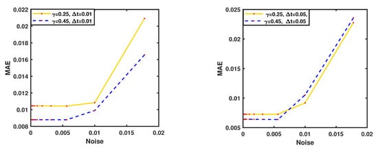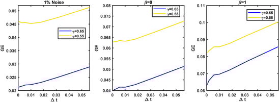 In order to further investigate the effect of the step time size and fractional order of derivative on the behavior of second-grade fluids, we will compute the as a function of based on the various values of at in Figure 4. Moreover, to see how the results are influenced by the collocation number point, we reported the errors for the selected level of noise in Figure 5. In the case of small-level noise at , the scheme provides more accurate results than when solving the problem with a noise level of using the same parameters. The following presents results for different values of the parameters and . We start with results for the parameter , , and , . Figure 6 shows the accuracy the problem versus various levels of added noise.