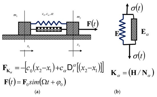 In Figure 1a, two material points (rigid bodies), mass and , are bound by a standard light rheologic basic complex of Kelvin–Voigt’s model of the fractional type (SLBC-KV-MFT), stiffness and , as a rheologic discrete dynamics system (RDDS) with two degrees of freedom of movement, and one degree of freedom of rheologic oscillations, one material point (rigid body) in relation to the other, subjected to the action of single frequency force , and for which are the positions are determined by independent generalized coordinates and .