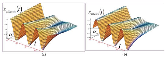 By analyzing the previous expression (27), for the analytical approximate generalized solution, , we come to the conclusion that we can divide it into two own-eigen modes -“likecos” and -“likesin”, which we define based on the following analytical approximate summation forms (for details see References [,]):