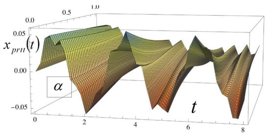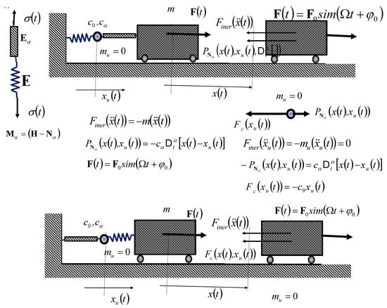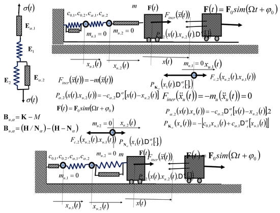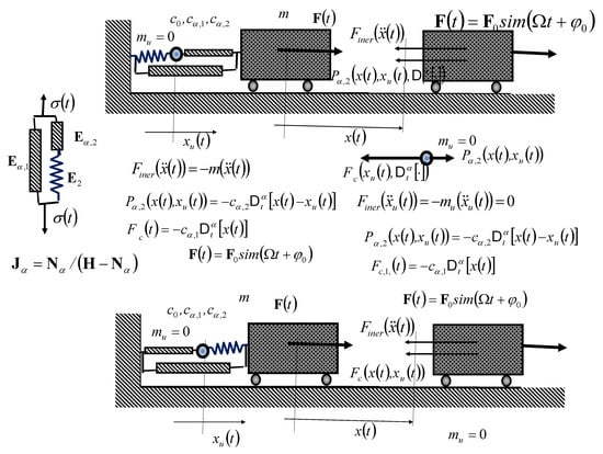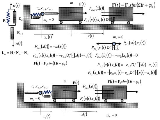The system of ordinary differential equations of the fractional order (SODEFO) of the dynamics of the rheological discrete dynamical system (RDDSFT), from Figure 1a, when action of the active single frequency force is acting, is as follows (for more details see Reference []):