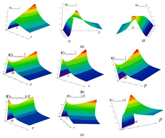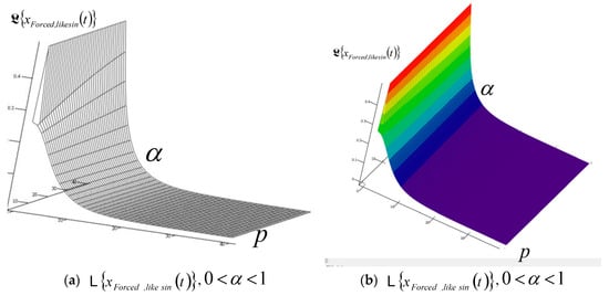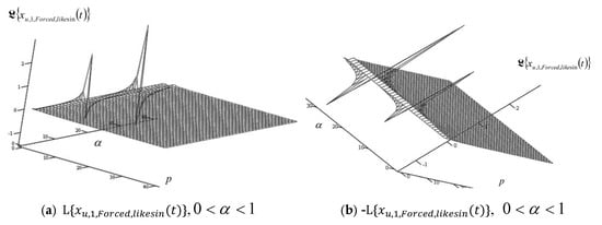 From the series of surface elongations of Laplace transforms of elasto-phisto-viscous forced modes of IGC of the external degree of freedom of motion, of a rheological Kelvin–Voigt discrete dynamic system under the action of an external single-frequency force , we observe that with an increasing frequency of the external force, the peak on the graph of the surface elongation of the Laplace transform of the elastophisto-viscous forced mode of forced oscillation increases, under the action of a single-frequency sinusoidal force , and is smallest for the zero value of the exponent of fractional order differentiation and largest when the exponent of fractional order differentiation is equal to unity. See and compare the shapes of the surface elongations of Laplace transforms from Figure 12 and Figure 13.