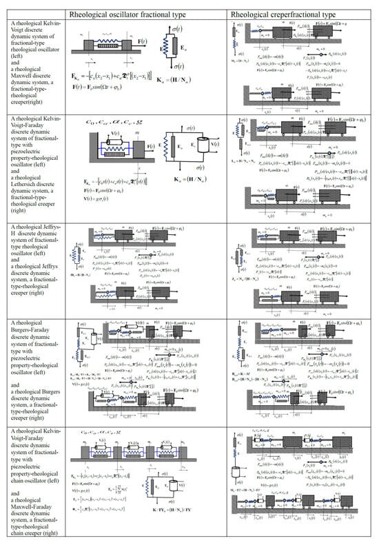 At the end, we point out, that in the last horizontal row of Figure 25, images of rheologic discrete dynamic systems of the type of rheologic homogeneous chains, fractional type with piezoelectric properties, are shown. One is of the type of the rheological Kelvin–Voigt–Faraday chain with oscillatory dynamics (left column) and the other is of the type of the rheologic Maxwell–Faraday chain with creeper properties with a finite number of degrees of freedom of flow. These models await theoretical mathematical analytical and experimental research.