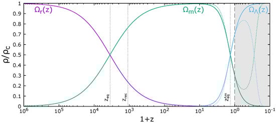 The evolution of densities of various components of the Universe in units of the critical density is shown in Figure 1. The total density is equal to the critical density with very high accuracy, since even small deviations from the critical density increase during the evolution. The vertical dashed line corresponds to the present moment, and the gray shaded region represents the future. The vertical dotted lines show epochs of equality of radiation and matter, , recombination, , and equality of dark energy and matter, . Solid colored lines show components of the standard CDM, and dotted lines represent a model, where is replaced by decaying dark energy, as suggested by recent DESI measurements [].