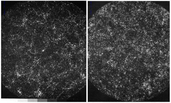 The first quantitative comparison of Peebles’ and Zeldovich’s structure formation models was conducted by Zeldovich et al. []. The authors investigated the properties of the distribution of real galaxies in the Virgo–Coma region using CfA data (sample O), the distribution of particles in a 3D simulation by Klypin and Shandarin [], calculated using the assumption that the dark matter particle population is made of neutrinos (sample A). The second model H was constructed according to the prescription described by Soneira and Peebles []. The two-dimensional view of this model is shown in the right panel of Figure 3. The authors used also the Poisson distribution of particles. Three tests were used: the spatial correlation function, percolation, and multiplicity tests.