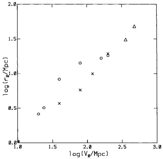 The next step was made by Einasto et al. [], who demonstrated that the correlation length is influenced not only by the luminosity of galaxies but also by the depth of the sample, as illustrated in Figure 6. This relationship between galaxy correlation length and sample depth was interpreted by Pietronero [] as evidence for a fractal structure in the distribution of galaxies. Pietronero emphasized that the fractal nature of galaxy distribution extends to infinitely large distances, suggesting that the entire Universe exhibits fractal characteristics. Furthermore, Jones et al. [] examined the galaxy distribution within the CfA redshift survey and in a simulation of the CDM model conducted by Gramann [,], which is recognized as one of the first CDM simulations featuring particles within a 40 Mpc box. The authors concluded that both the galaxy distribution and the CDM model can be effectively described using a multifractal approach, indicating that the fractals possess more than one scaling index. The dimensionality of this distribution varies between 1 and 3.