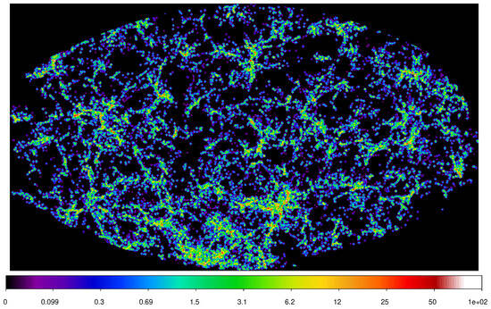 Einasto et al. [] used the luminosity-limited galaxy samples by Tempel et al. [], selected from data release 10 of the SDSS galaxy redshift survey []. The catalog has a Petrosian r- band magnitude limit and contains 489, 510 galaxies. The SDSS samples have magnitude limits , , , , and and are referred to as SDSS.18t, SDSS.19t, SDSS.20t, SDSS.21t, and SDSS.22t. The effective size of the sample is 500 Mpc. One view of the SDSS density field is presented in Figure 8. We see here a complicated network of clusters, filaments, and voids. The rich complex of superclusters in the lower part of the Figure is the Sloan Great Wall, which actually consists of three superclusters [].