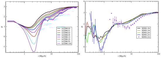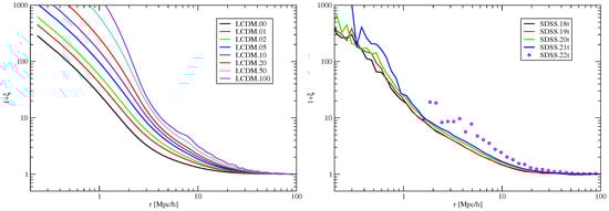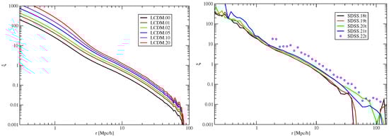 Correlation functions of CDM and SDSS samples are shown in the left and right panels of Figure 9, respectively. Figure 9 shows that samples with different galaxy luminosity and particle density limit form approximately parallel sequences, where the amplitude of the correlation functions increases with the increase in the luminosity/density limit. For galaxy samples, the amplitudes of the correlation functions are almost constant for low-luminosity samples and rise for samples brighter than approximately . The behavior of CDM model particle density selected correlation functions is different—with increasing particle density threshold , the amplitudes rise continuously. The luminosity dependence of the correlation functions is the principal factor of the biasing phenomenon, as shown by Kaiser []. A further discussion of the correlation length is given in the following subsection.