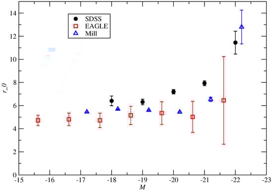 The data presented above allow calculating the correlation lengths of observed SDSS samples and simulated Millennium and EAGLE samples. In Figure 10, I show the correlation lengths, , of the SDSS, EAGLE, and Millennium samples as functions of magnitude . We see that, for low and intermediate luminosities, all samples have correlation lengths Mpc, which rises to higher values for more luminous galaxies. The correlation length has a rather similar luminosity dependence for all samples. The luminosity dependence of the correlation functions is the principal factor of the biasing phenomenon, as discussed by Kaiser [].