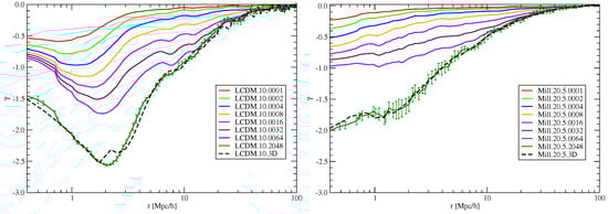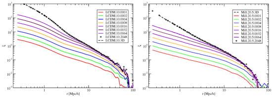 In the early years of the 21th century, new redshift surveys were published—the 2dF and the Sloan Digital Sky Survey (SDSS). The 2dF survey by Colless et al. [] allowed finding angular correlation functions of 2dF galaxies [], discussed in Section 3.1. Next, the SDSS was available [,,], which allowed studying the distribution of galaxies in much larger volumes of space. It was used to calculate correlation functions and power spectra of SDSS galaxies by Tegmark et al. [] and Zehavi et al. []. New large numerical simulations of the cosmic web were developed, which included hydrodynamical processes of formation and evolution of galaxies — the Millennium simulation by Springel et al. [] and the Illustris The Next Generation (IllustrisTNG) simulation by Springel et al. []. These observational and modeling possibilities allowed studying the character of the distribution of dark matter and galaxies in much more detail.