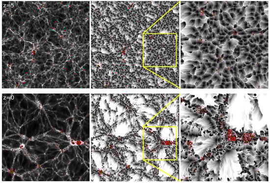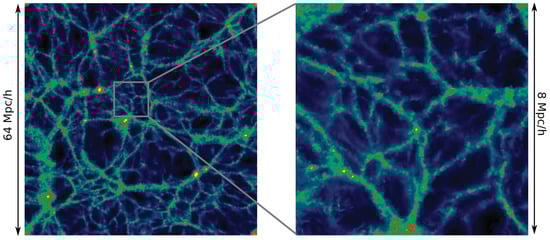 Sergei Shandarin’s early numerical simulations were groundbreaking in illustrating the evolution of particles through gravitational clustering, based on the theory developed by Zeldovich []. In the right panel of Figure 5, you can see a fascinating system of high- and low-density regions. High-density areas are compact and clumped together, forming a network of filaments that enclose expansive under-dense regions. This visualization was pivotal, as it gave the first glimpse into the Universe’s structural patterns as predicted by the Zeldovich model.