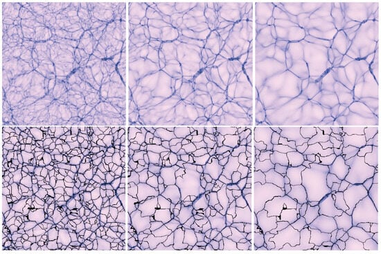 - Bond, J.R.; Kofman, L.; Pogosyan, D. How filaments of galaxies are woven into the cosmic web. Nature 1996, 380, 603–606. [Google Scholar] [CrossRef]