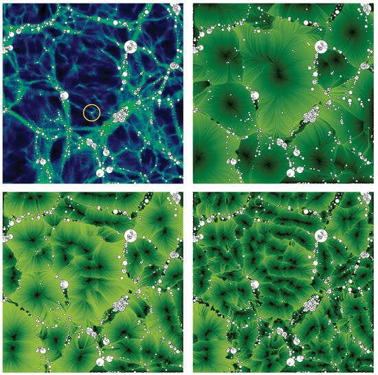 - Klypin, A.A.; Shandarin, S.F. Three-dimensional numerical model of the formation of large-scale structure in the Universe. Mon. Not. R. Astron. Soc. 1983, 204, 891–907. [Google Scholar] [CrossRef]