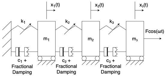 where , , and denote the damping coefficients, linear stiffness constants, and cubic nonlinear stiffness coefficients, respectively, for each mass . The coupling terms and represent the linear spring stiffness between adjacent masses, and denotes the fractional derivative of order applied to each displacement, capturing the memory-dependent damping behavior of the system. The external forcing applied to the third mass serves to excite the system persistently, ensuring the development of a rich steady-state response suitable for frequency domain analysis. The multi-DOF coupled system can be represented in a schematic which is shown below: