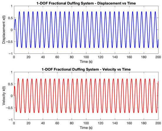 Once the single-degree-of-freedom (1-DOF) fractional Duffing oscillator reaches its steady-state under harmonic excitation , the displacement response becomes approximately periodic with the same fundamental frequency . This periodicity enables an efficient representation of the system’s response using a truncated Fourier series, allowing analytic reconstruction of displacement, velocity, acceleration, and fractional derivatives in the frequency domain.