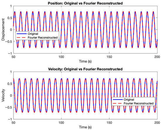 Using the Fourier coefficients, we can reconstruct the time domain signals for position, velocity, and acceleration. The position is directly reconstructed from the inverse FFT of the coefficients, while the velocity and acceleration can be obtained by differentiating the position signal in the frequency domain. The reconstructed velocity and acceleration are given by the following: