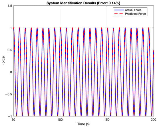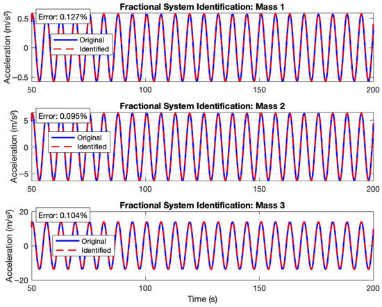 The fractional Fourier reconstruction validates the adequacy of the selected spectral resolution. Specifically, when 1000 Fourier terms are employed in the advanced reconstruction, the steady-state displacement responses of all three masses are recovered with sub-percent accuracy, yielding an average relative error of only for each mass. The large number of harmonics ensures that even relatively subtle spectral features induced by the fractional-order damping and nonlinear stiffness are faithfully represented, leading to smooth, noise-resilient reconstructions of position, velocity, acceleration, and fractional derivatives. Together, the removal of the transient portion and the adoption of a high-order Fourier basis combine to produce highly accurate regressor inputs and, consequently, to reduce the overall fractional system identification error to an noticeably low . Another important observation is that, for the single-degree-of-freedom (1-DOF) oscillator, the periodic steady-state response is primarily governed by the fundamental excitation frequency, with additional contributions from a limited number of higher harmonics arising due to the cubic nonlinearity. In this case, truncating the Fourier series to harmonics captures virtually all of the significant spectral content—higher-order harmonics beyond the tenth contribute negligibly to the signal-energy and their omission introduces reconstruction errors well below 1%. By contrast, the three-degree-of-freedom (3-DOF) system exhibits richer modal interactions and coupling harmonics among the three masses. Its steady-state response therefore contains a much denser spectrum of frequency components, both at the excitation frequency and at combination harmonics arising from nonlinear coupling. To resolve this more complex spectrum over the long analysis window (50–200 s), the advanced Fourier method employs 1000 terms, ensuring that all relevant harmonics—and the fine spectral features induced by fractional damping and inter-mass coupling—are retained. This high harmonic count yields sub-percent reconstruction errors (≈0.47%) and enables the equally low identification errors (≈0.10%) reported for the 3-DOF system.
