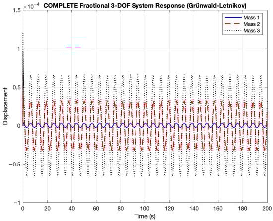 While recent studies in fractional-order system identification frequently employ the Caputo fractional derivative due to its intuitive physical interpretation of initial conditions, the Grünwald–Letnikov (GL) formulation offers distinct advantages for the present framework. In particular, the GL characterization is computationally efficient in discrete time implementations, as it avoids explicit integration and instead relies on factorial and summation operations [35]. Furthermore, the GL approach exhibits a natural convolutional structure in which past displacement values are incorporated through recursively decaying weights. This feature makes it particularly well-suited for long-duration numerical simulations required to capture steady-state responses in the coupled 3-DOF system. In contrast, the Caputo derivative requires explicit handling of initial conditions and typically involves more complex numerical schemes. By comparison, the GL discrete time representation enables efficient memory embedding via a weighted summation of historical states, thereby enhancing both numerical stability and computational efficiency, which are essential for iterative parameter estimation [1]. Given that the present study emphasizes steady-state frequency domain identification rather than transient response modeling, the GL formulation is more advantageous than Caputo’s initial condition-based interpretation. Moreover, the GL method’s binomial coefficient weighting scheme inherently captures memory effects and facilitates the construction of smooth, noise-resilient fractional derivatives, since numerical errors are not accumulated at each computational step. This property is particularly critical for robust pseudoinverse-based parameter estimation within the proposed Fourier-based identification framework.