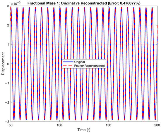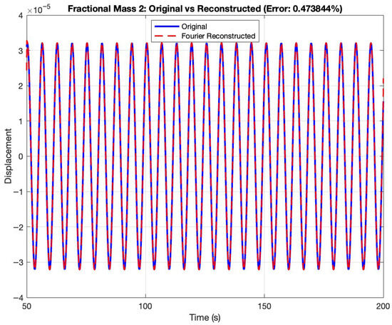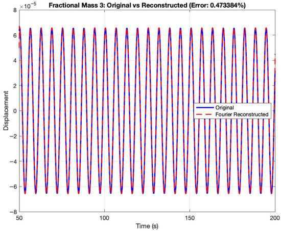 The exceptionally precise Fourier reconstructions across all three masses substantiate several important theoretical aspects of fractional-order systems. First, they confirm that despite the nonlocal nature of fractional derivatives and their inherent memory effects, the steady-state forced response maintains periodicity that is amenable to Fourier analysis. Second, they demonstrate that a finite number of harmonic components is sufficient to represent the dynamics of the fractional-order system with high accuracy. This finding has significant implications for system identification and model reduction techniques in fractional-order mechanical systems.