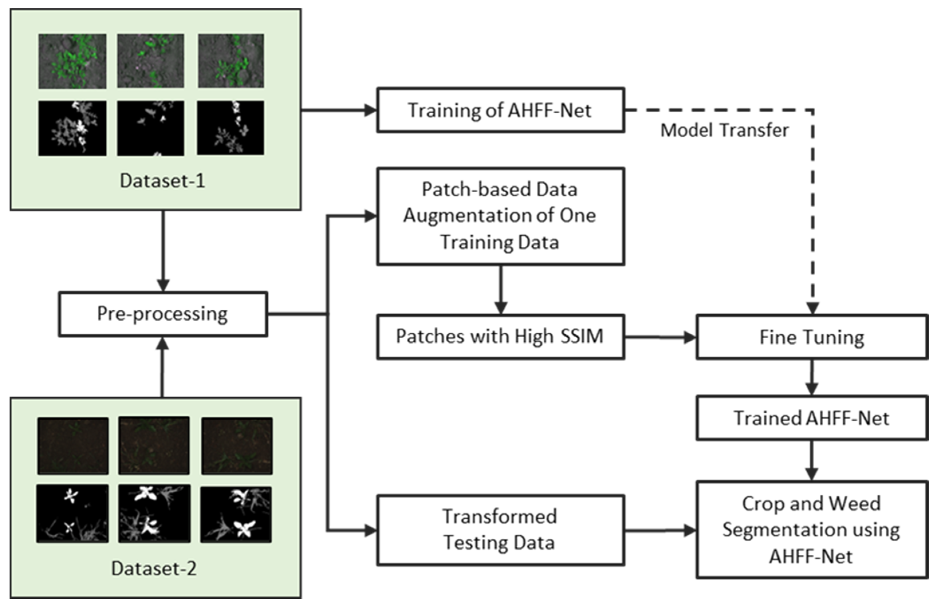 - This study proposes AHFF-Net, which incorporates patch-based augmentation to improve the accuracy compared to previous methods. This method effectively addresses the challenges of a heterogeneous dataset environment for semantic segmentation of crops and weeds.