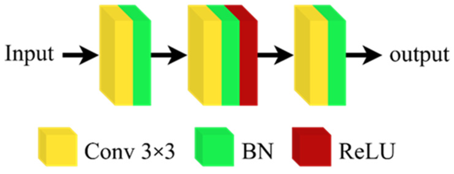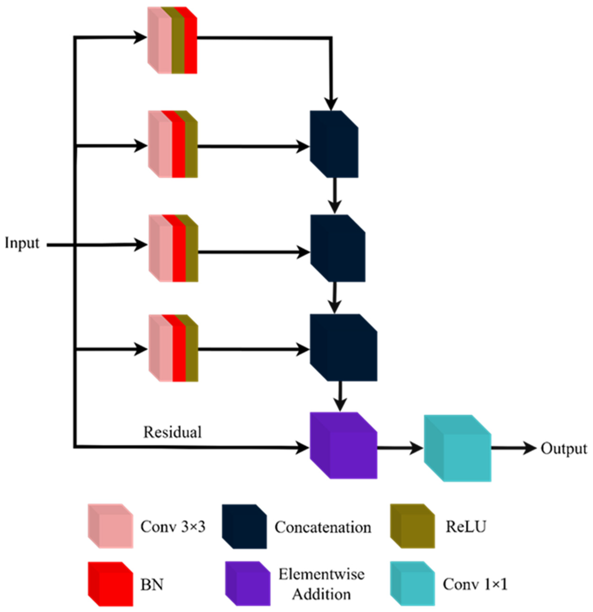 - AHFF-Net includes a progressive encoder-stage refinement block (PERB) as part of the encoder. The PERB enhances feature extraction by capturing more sophisticated details such as the edges and textures of crops and weeds through deeper convolutions while preserving the feature map size. Additionally, the PERB improves low-level feature retention and helps prevent the loss of critical region-level information on crops and weeds. This enables the progressive refinement of spatial features before downsampling at each encoder stage. This is particularly favorable in heterogeneous field environments, where the high intraclass variability (e.g., varying crop textures) and low interclass separability (e.g., weeds replicating crop morphology) challenge conventional encoders. By enriching the representation before resolution reduction, PERB preserves the fine-grained cues essential for distinguishing visually similar classes. The symmetrical design also facilitates a smoother gradient flow and stabilizes the training. Thereby, it improves the generalization of the model to unseen or complex conditions that agricultural segmentation tasks generally involve.