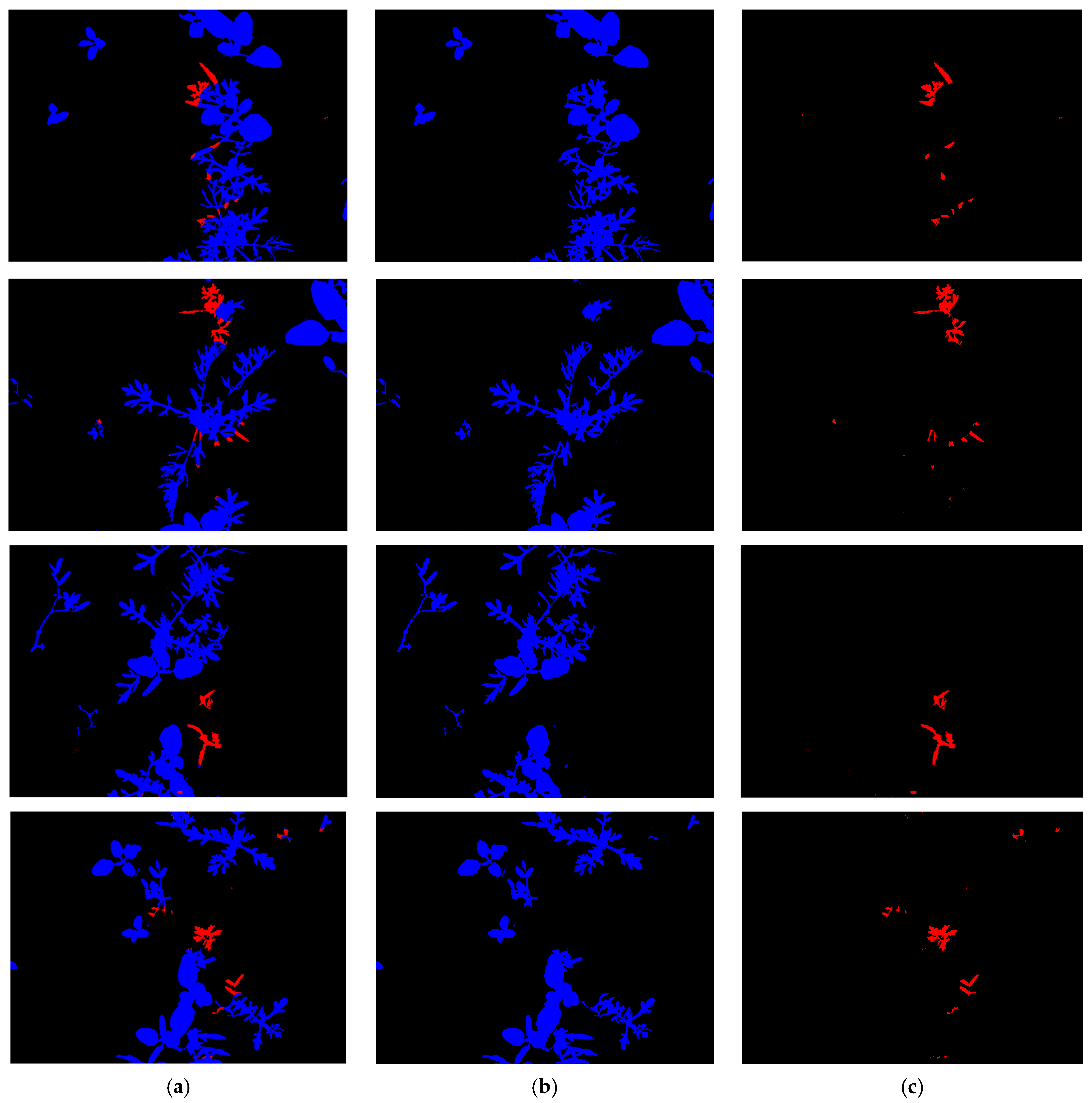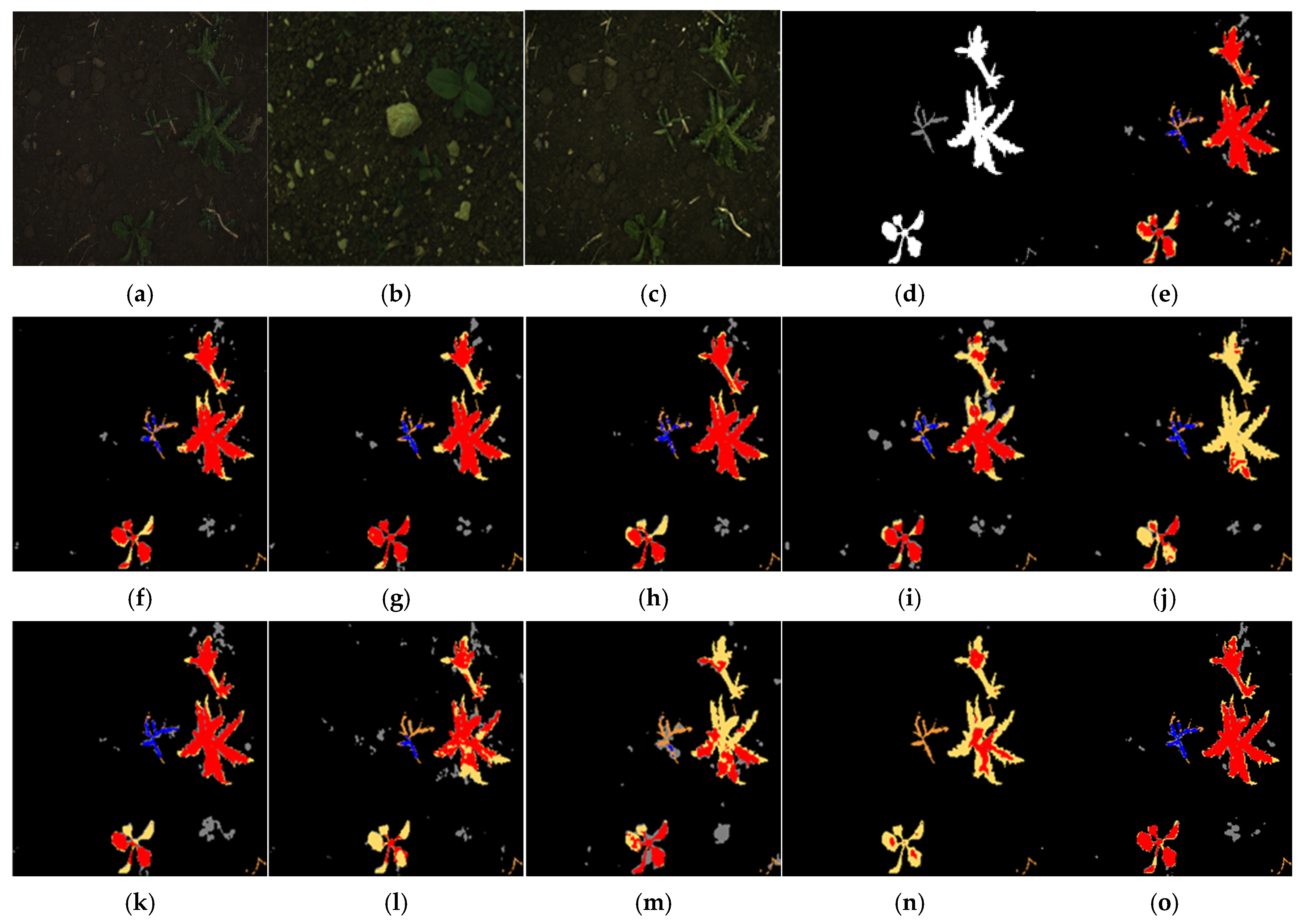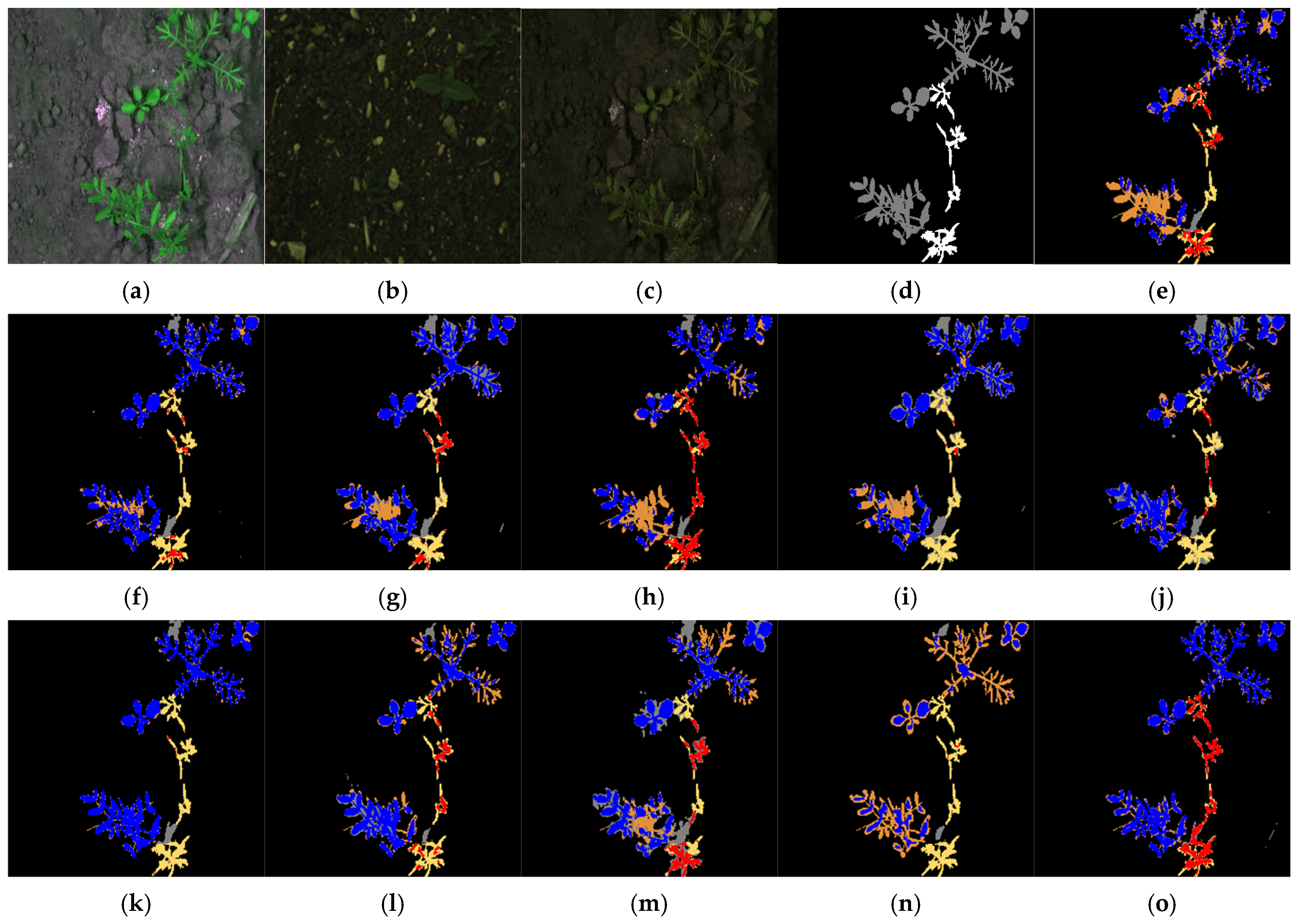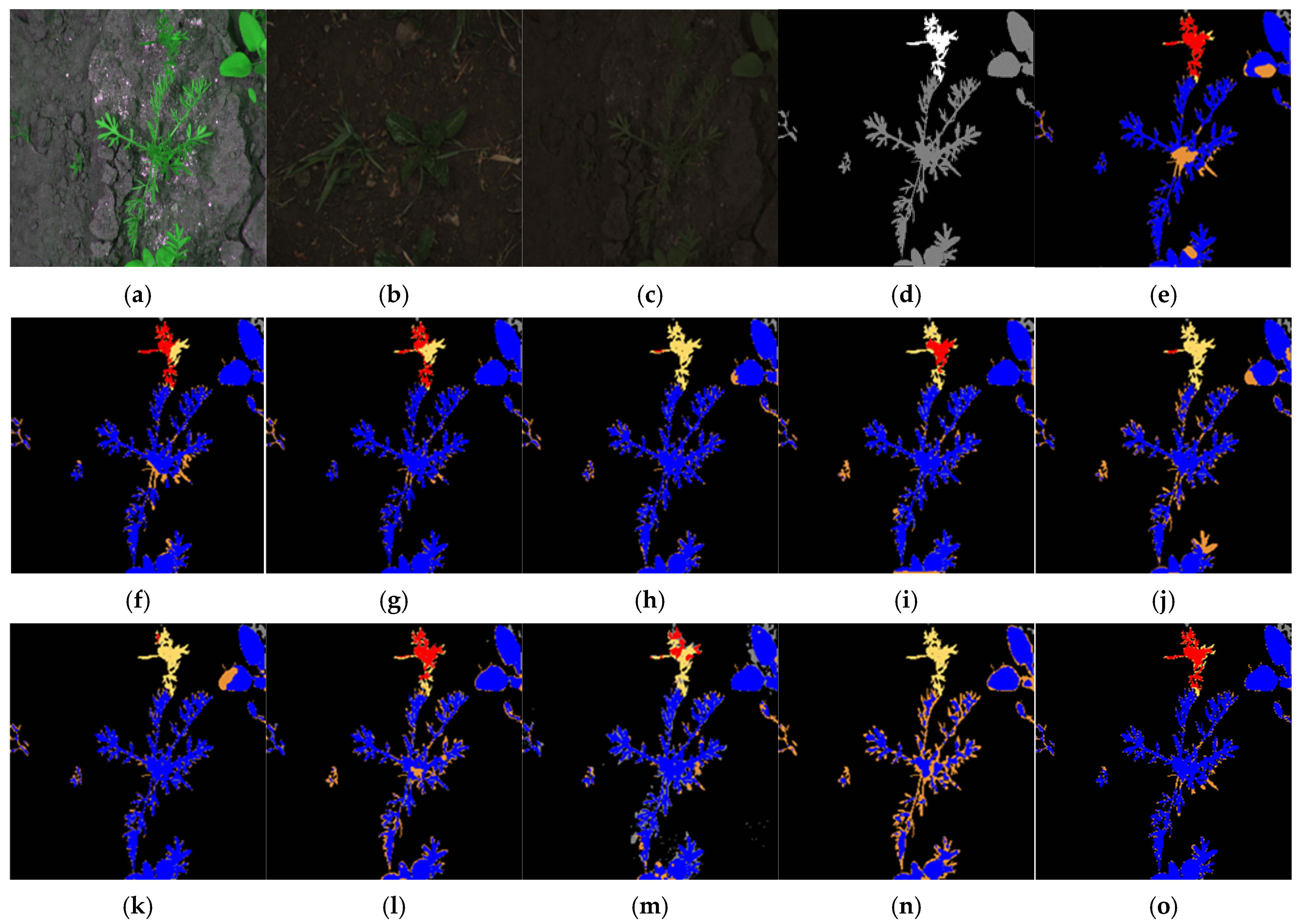 - Liu, Y.; Liu, M.; Zhao, X.; Zhu, J.; Wang, L.; Ma, H.; Zhang, M. Real-time Semantic Segmentation Network for Crops and Weeds Based on Multi-branch Structure. IET Comput. Vis. 2024, 18, 1313–1324. [Google Scholar] [CrossRef]