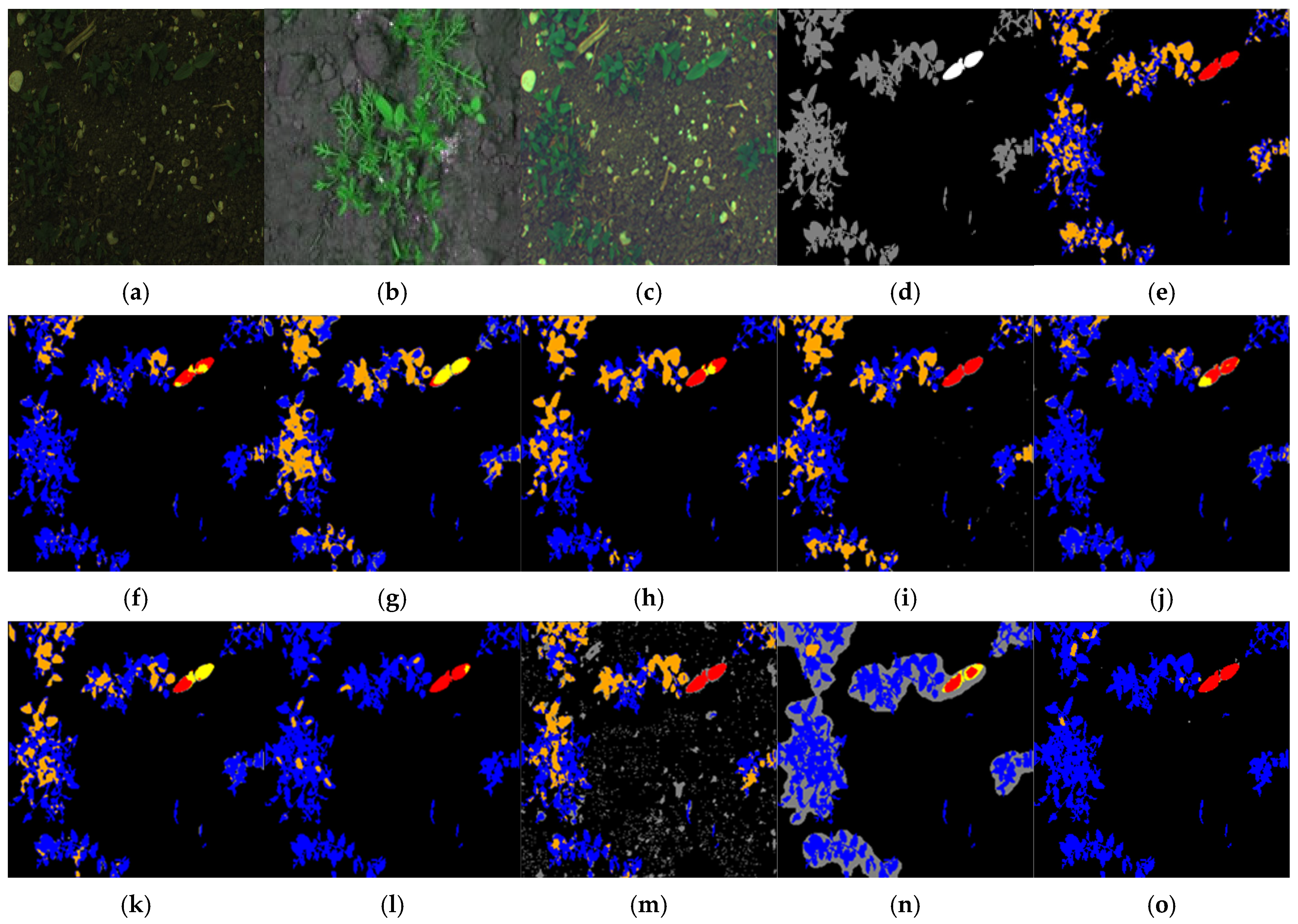 - Gupta, S.K.; Yadav, S.K.; Soni, S.K.; Shanker, U.; Singh, P.K. Multiclass Weed Identification Using Semantic Segmentation: An Automated Approach for Precision Agriculture. Ecol. Inform. 2023, 78, 102366. [Google Scholar] [CrossRef]