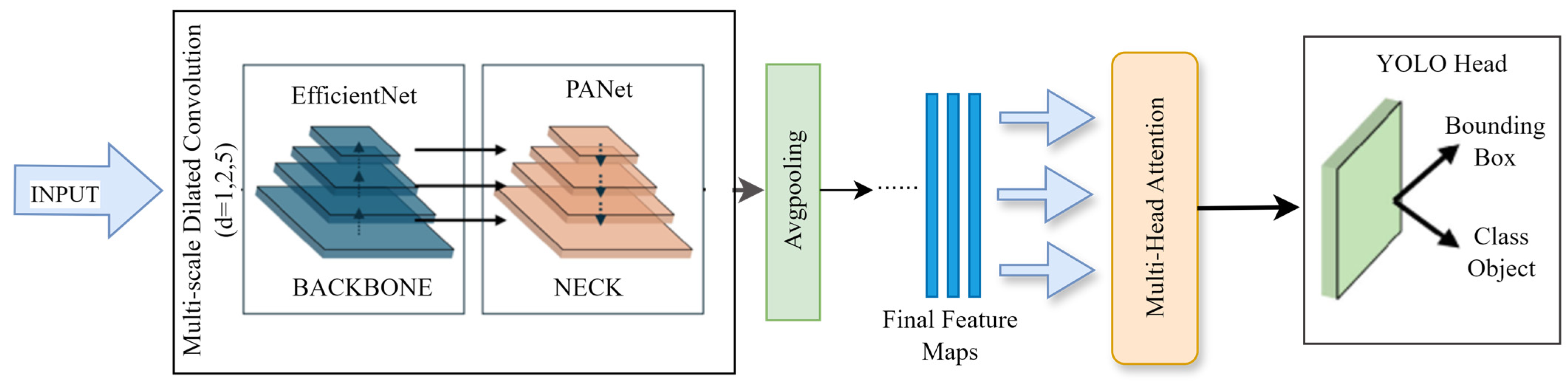 30] is utilized as a backbone network that attempts to achieve feature representation through its lightweight model that enables its use in edge devices and provides real-time quality assurance without loss; it is therefore a perfect backbone network for real-time detection. EfficientNet’s architecture utilizes a combination of depthwise convolutions, inverted residual bottlenecks, and channel-wise attention (Squeeze-and-Excitation) modules, effectively capturing hierarchical representations from weld images. Additionally, to address the multi-scale and fractal-like complexity of real-world defects, our model integrates multi-scale dilated convolution blocks within the feature extraction process. Each of these blocks runs parallel convolutional filters with dilation rates of 1, 2, and 5, aggregating their outputs to emulate the behavior of a fractional integral operator. While our multi-branch convolutional design exhibits self-similarity and multi-scale dilation patterns, we do not claim a formal fractal construct. Instead, we leverage architectural intuition from prior works like FractalNet to efficiently capture spatial hierarchies across multiple receptive fields. This fractal-inspired design expands the effective receptive field and enriches features across scales, all without increasing parameter count, supporting both computational efficiency and superior sensitivity to diverse defect morphologies. Grounded in fractional-order systems theory and aligned with the latest advances in fractal neural network, the features extraction flows are as follows: