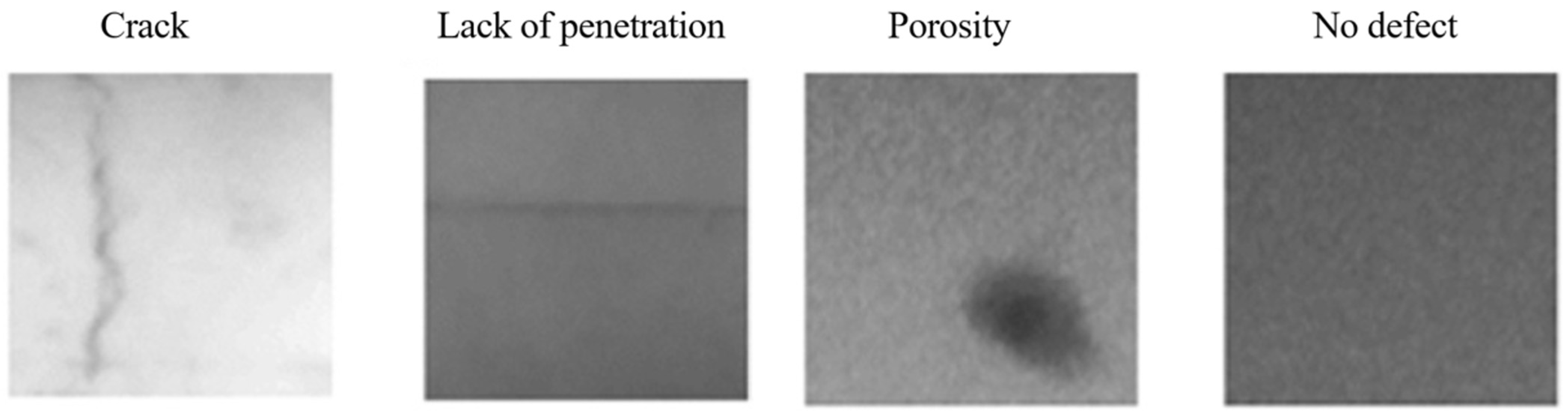 31] collects 24,407 224 × 224 8-bit radiographic images digitalized in the.png format with four classes of weld defects represented as lack of penetration (LP), porosity (PO), cracks (CRs) and no defect (ND) as shown in