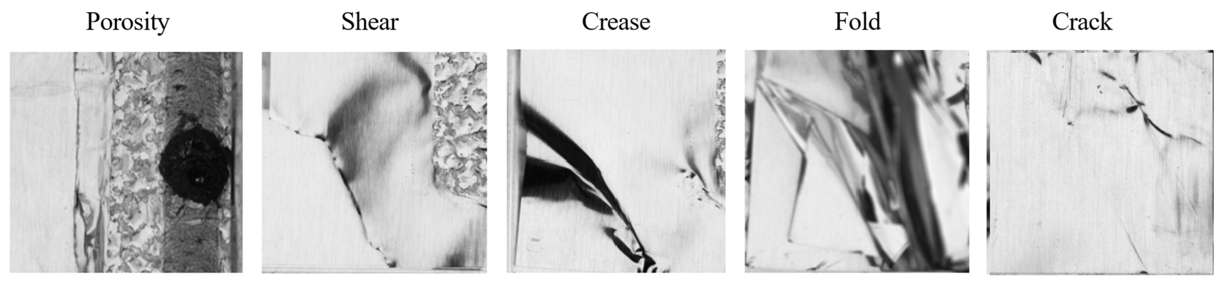 Figure 5. These images cover defect types inherent to ultrasonic welding for TAB and busbar joints, including cracks, fold, porosity, crease, and shear. Each image is meticulously annotated by domain experts of production line to accurately label defect locations and types, ensuring high-quality labels for supervised learning.