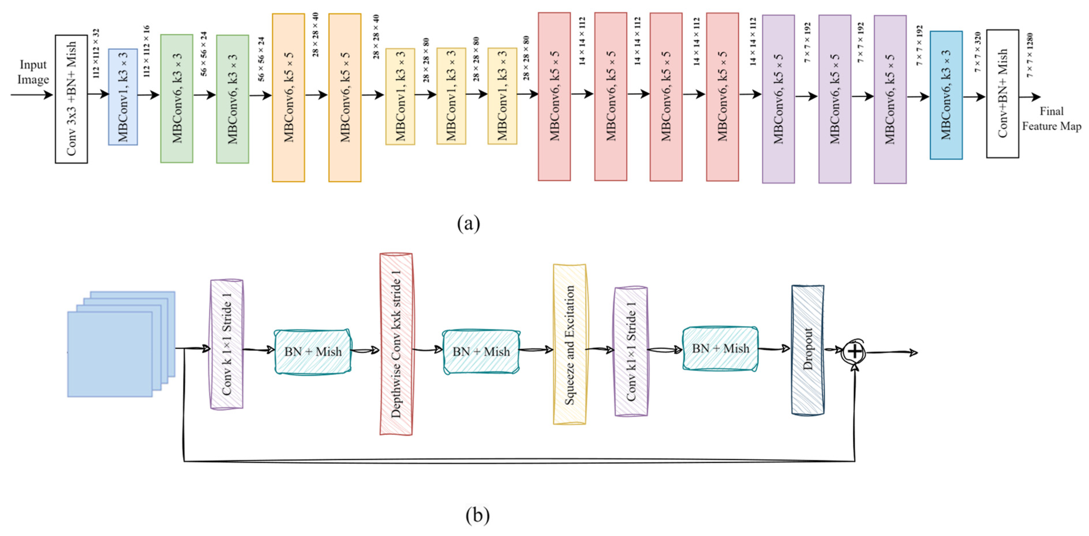 47], the mobile inverted bottleneck (MBConv) is a key component of EfficientNet-B0. EfficientNet processes the input images through a series of convolutional layers, capturing hierarchical features ranging from low-level edges and textures to high-level defect patterns. Each convolutional block produces a feature map