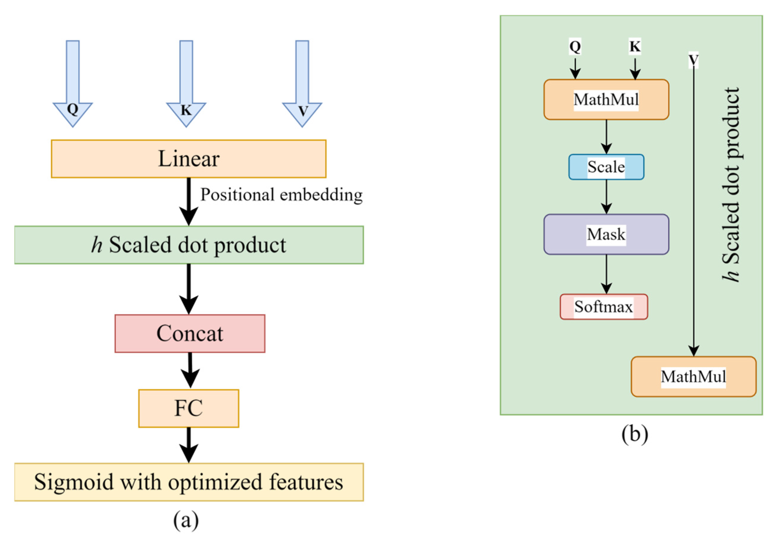 are learnable projection matrices that enable the model to focus on specific feature subspaces. Such vectors can actually serve as an abstraction for the calculation of attention. The similarities of the query and key vectors used to compute the attention weights are calculated from the scaled dot product in the following equation: