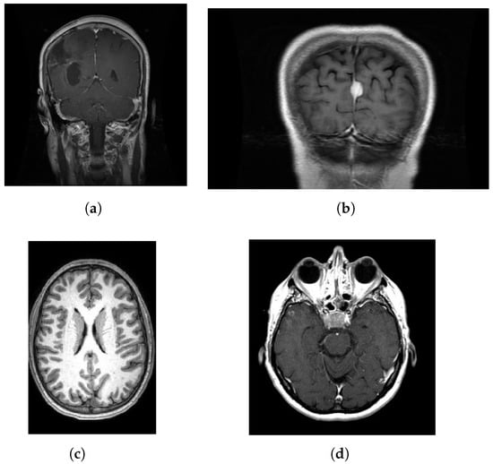 Brain tumors are among the most destructive and life-threatening malignant nervous system tumors. They have high incidence and mortality rates. These tumors severely impact patient health [,]. Due to the rapid growth of tumor cells, thousands of people die every year []. Surgical removal of brain tumors is a crucial treatment method. However, due to the complexity of brain tissue and the unique growth patterns of tumors, achieving complete resection presents numerous challenges. Therefore, accurate and rapid identification of brain tumors is critical for planning treatment, predicting disease direction, and tracking outcomes [,]. In the process of classifying brain tumors, the symmetrical or asymmetrical nature of the tumor serves as a crucial basis for diagnosis. From a morphological standpoint, tumors with symmetrical features are usually categorized as benign or low-grade. In contrast, tumors with asymmetrical features are more often identified as high-grade malignancies. Specifically, symmetrical tumors generally exhibit slow growth and a lower likelihood of dissemination within the brain. Magnetic resonance imaging (MRI) is a medical examination technique, which uses magnetic fields and radio waves to generate images of the body’s internal structures. It produces detailed images by detecting the reaction of water molecules in the human body in a strong magnetic field. It plays a crucial role in detecting and diagnosing brain tumors and aids physicians in clearly identifying the location, size, and nature of the tumors [,]. Currently, MRI stands out as the premier approach for early identification of brain tumors in clinical diagnosis []. However, the method of manual judgment is often due to too few experienced doctors and too many patients, which is prone to misjudgment and missed judgment []. The study examines four types of brain tumor lesions: glioma, meningioma, no tumor, and pituitary. Glioma is a highly malignant tumor that originates from the brain’s glial cells and typically has a poor prognosis. Meningioma is a benign tumor that originates from the meninges, characterized by slow growth and the potential to compress brain tissue. The “no tumor” category indicates the absence of any tumor. Pituitary tumors originate from the pituitary gland and are mostly benign. These four types of brain tumors are depicted in Figure 1.