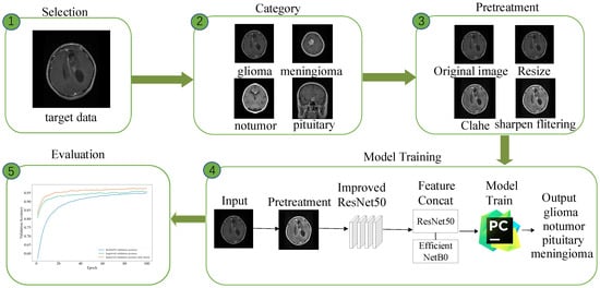 The main goal of this paper is to utilize the ResNet50 deep learning model for early brain tumor detection [] and to enhance the model’s precision and computational efficiency through network structure modifications, transfer learning, and integration of the EfficientNetB0 lightweight module. However, the original medical images have problems such as asymmetric image size, poor image quality, and insufficient contrast, which lead to the inability to directly feed the images to the model or affect the training performance of the model. In addition, brain tumor datasets are often limited in number; as shown in Table 1, two datasets are selected but only 1705 images are selected, resulting in the model being susceptible to overfitting and the validation performance being diminished. The workflow of the brain tumor identification framework is depicted in Figure 2, which includes five steps as image selection, categories of brain tumors, image preprocessing, model training, and model evaluation.