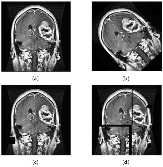 As depicted in Figure 4, (a) is the original image of the pre-processed MRI, (b) is the MRI image randomly flipped between [−180°–180°], (c) fills in the 0 pixel value of 1 × 1 to cut off part of the area in the MRI, and (d) crops the image into four parts, and each part applies a different image enhancement technique. By applying different image enhancement techniques to increase the variety of images, we avoid overfitting images and improve the generalization ability.