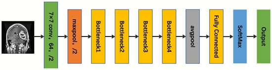 The advantage of selecting the ResNet50 architecture is its superior performance and computational efficiency []. ResNet50 addresses issues related to vanishing and exploding gradients in deep network training via residual connections, enabling the network to capture more intricate feature representations and thereby significantly enhancing the model’s precision and adaptability. Additionally, ResNet50 demonstrates strong performance on multiple benchmark datasets, possesses robust transfer learning capabilities, and can rapidly acclimate to diverse tasks and datasets. Consequently, this study utilizes ResNet50 as the core framework, with the ResNet50 framework illustrated in Figure 7.