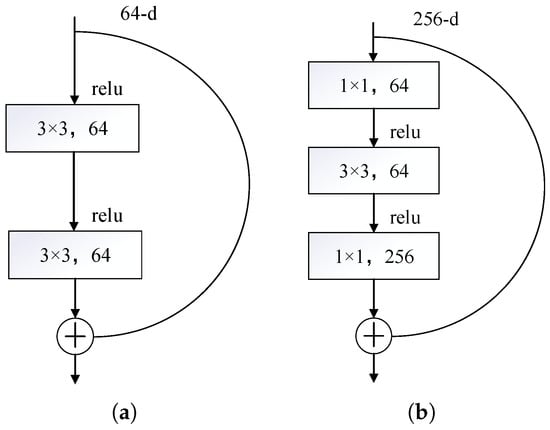Figure 8a and Figure 8b show two different residual configurations: Basic residual configurations and Bottleneck residual configurations, respectively. Both configurations are core components of ResNet and are used to build networks at different depths. The base residual block contains two convolutional layers with a 3 × 3 kernel, each followed by a nonlinear activation function. The residual connection then adds the input directly to the output of the convolutional layer and then activates the function through a nonlinear operation. The residuals of the bottleneck residual structure are connected in the same way as the basic residual block, and the convolutional layer includes three convolutional layers, two convolutional layers with a 1 × 1 kernel and one convolutional layer with a 3 × 3 kernel. Both residual structures require a 1 × 1 convolution to restore the original channel count because a 1 × 1 convolution provides channel alignment for residual connections and other structures, ensuring that the feature maps of different branches can be added correctly. The 1 × 1 convolution enhances feature expression ability while maintaining the channel count.