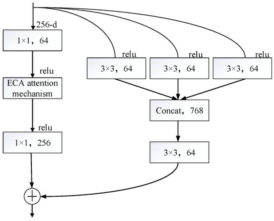 In Equation (9), C denotes the channel count of the input data, while H and W correspond to the spatial dimensions (height and width) of the data. indicates the values of the data X at positions , and represents the output after applying global average pooling. Equation (9) describes a global average pooling (GAP) operation whose purpose is to compress the spatial dimensions (height H and width W) of each channel of the input feature graph X into a single value, resulting in the global descriptor for each channel. In Equation (10), Y and b represent the hyperparameters used to control the calculation of the size of the convolutional kernels. denotes the logarithm function with base 2. The logarithm function computes the logarithm of C to base 2. This operation is commonly used for scaling or normalizing data. represents the closest odd number as the convolutional kernel size usually needs to be odd. The goal of Equation (10) is to dynamically determine the kernel length k for the 1D convolution according to the channel count C of the input data. This avoids manually resizing convolutional cores. In Equation (11), represents the kth feature extraction function applied to input . Here, is the input feature, and is a function used to extract a specific feature representation from the input feature. is the weight parameter of the one-dimensional convolution, represents a one-dimensional convolution operation on to generate an intermediate feature , and represents the activation function and is used to introduce nonlinearity. Equation (11) describes a one-dimensional convolutional operation in the ECA attention mechanism to generate channel attention weights z. In Equation (12), X is the input matrix, and Y is the output matrix. is the channel attention weight normalized by the Sigmoid activation function, and ⊙ represents element-wise multiplication operations. This means that each pixel value for each channel is multiplied by the corresponding channel attention weight. Equation (12) describes how to adjust the original feature map X using the channel attention weight z; important features can be enhanced and unimportant features can be suppressed by channel attention weight . Therefore, in order to optimize the performance of the proposed model, the standard convolutional layer in the residual module is replaced by the ECA attention module. This substitution addresses the limitations of the self-attention mechanism when dealing with limited data and improves the model’s ability to handle fine-grained details. The design of residual blocks aims to effectively mitigate issues related to vanishing gradients and network degradation in deep neural networks. By incorporating residual branches, the network is able to focus on learning the differences between the input and output (i.e., the residuals) instead of attempting to learn the entire mapping relationship directly. The fundamental structure of the residual module is as follows: