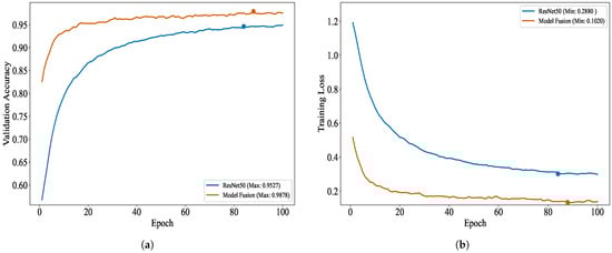 Training and loss metrics: (a) validation performance plot for ResNet50 and model fusion and (b) validation loss plot for ResNet50 and model fusion.