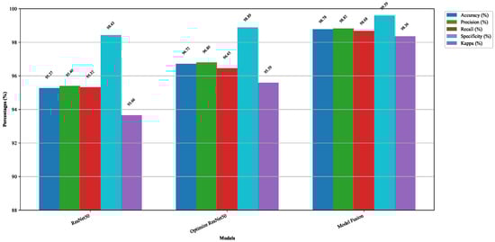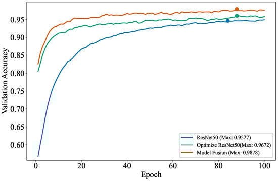 From this figure, the highest validation accuracy of ResNet50 after 100 iterations is 95.27%. Optimized ResNet50 refers to the modification of the residual structure of ResNet50, including the addition of the ECA attention mechanism and multi-scale convolution, and it achieves the highest validation accuracy of 96.72% after 100 epochs. Model fusion refers to the feature fusion of the optimized ResNet50 with the lightweight EfficientNetB0, the highest validation accuracy of model fusion after running 100 rounds is 98.78%.