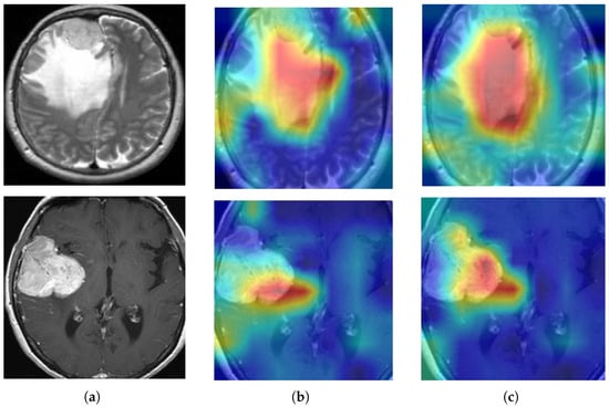 To visually illustrate the impact of model enhancement and fusion, Grad-CAM technology is employed for visual analysis. In the heatmap generated by Grad-CAM, different colors represent the varying degrees of attention the model gives to different areas of the input image. The red areas indicate the parts that the model pays the most attention to; these areas contribute the most to the model’s decision and are typically where the model identifies the most relevant features. The yellow areas indicate a moderate level of attention from the model, contributing to the decision to some extent but not as significantly as the red areas. The blue areas represent the parts with the lowest level of attention, contributing the least to the decision, often consisting of background or unimportant feature areas. Grad-CAM produces heat maps that pinpoint crucial regions in the model’s reasoning process, shedding light on how it reacts to input data. To eliminate interference from redundant black borders, the image is trimmed to remove the surplus areas. As depicted in Figure 14, Column (a) displays the cropped brain tumor images, Column (b) shows the corresponding Grad-CAM visualizations, and Column (c) presents the Grad-CAM images following model optimization and fusion.