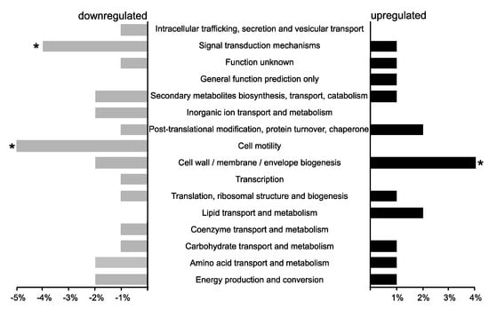 Functional categories of the top 200 differentially expressed genes of the P. phymatum STM815 wild type versus σ54 mutant (gray, downregulated genes, black upregulated genes) under nitrogen starvation according to eggNOG classification []. The asterisks (*) indicate statistical significance for over-represented genes in a particular category (p-value < 0.02).