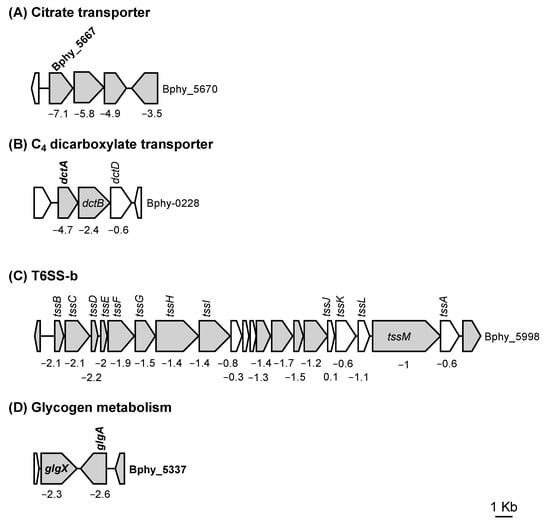 Four P. phymatum STM815 gene clusters showing significant downregulation in a σ54 mutant compared to the wild type: (A) Citrate carrier protein and associated two-component regulatory system (TCRS), (B) C4 dicarboxylate transporter T6SS-b, (C) T6SS-b, and (D) glycogen metabolism. Genes containing an RpoN box in their promoter region are indicated in bold. The top 200 regulated genes are colored gray. The log2 of the fold change has been indicated below the genes in the cluster of interest.