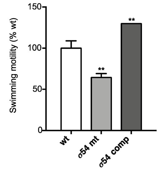 3.2.2. σ54 Positively Controls Swimming Motility