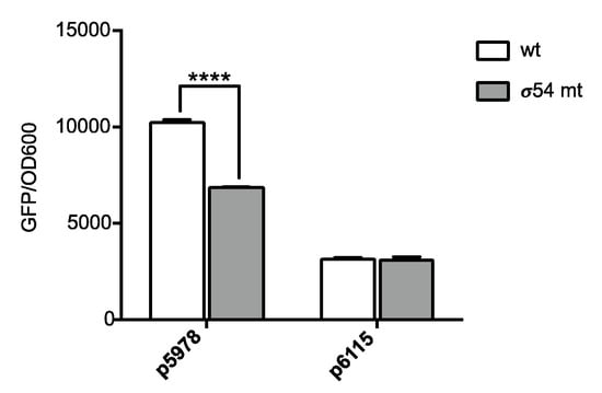 Our RNA-Seq data showed that the expression of one P. phymatum STM815 cluster coding for a T6SS (Bphy_5978-97, T6SS-b cluster) was dependent on σ54 under nitrogen-limiting growth conditions (Figure 2C). Both P. phymatum STM815 T6SS systems were previously shown to be important for competition with other related Paraburkholderia strains such as P. diazotrophica []. In order to validate the RNA-Seq data, the promoters of Bphy_5978 (T6SS-b cluster) or Bphy_6115 (T6SS-3 cluster) were fused with gfp, and expression was measured in the P. phymatum STM815 wild-type and the σ54 mutant background. In accordance with the transcriptome data, only the expression of the T6SS-b cluster (p5978), and not of the T6SS-3 cluster (p6115), was decreased in a P. phymatum STM815 σ54 mutant compared to the wild-type strain (Figure 4).