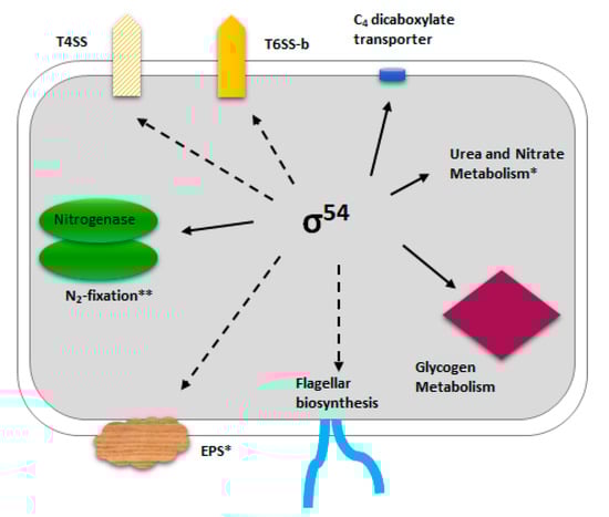 Schematic representation of the phenotypic traits regulated by σ54 in P. phymatum STM815. Direct σ54 targets (with an RpoN-binding motif in the promoter region) are indicated with a solid line. * Lardi et al. 2017; ** Lardi et al. 2018; T6SS, Type 6 Secretion System; T4SS, Type 4 Secretion System; EPS, Exopolysaccharide.